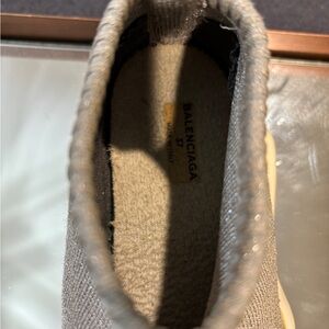 Sleek gray sock sneakers by Balenciaga. Modern design with a comfortable fit. Stain on the toe and some blemishes on the gum bottoms