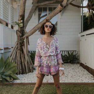 NWOT Spell (Spell & the Gypsy Collective) Buttercup Romper in Meadow | Size XS A classic Spell silhouette in a signature print that's perfect for brunch, dinner dates and everything in between. With its relaxed feminine vibes, this romper is as comfortable as it is charming. • Condition: New without tags. Never been worn. Excellent condition. • Size: S • Color: Meadow • Originally retailed at Spell for $179.00 USD