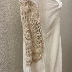 Elegant one-shoulder jumpsuit. Features crocheted detailing. Perfect for special occasions.