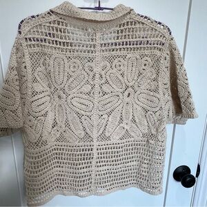 Elegant cream crochet top with floral design. Features button-up front.
