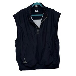 Stay comfortable on the course with this Adidas Men's ClimaShell Wind Golf Vest in size Large. Features a wind-resistant shell, mesh lining, and half-zip design for breathable performance. Classic navy blue colorway with front zip pockets and embroidered Adidas logo. Great for golf, coaching, outdoor sports, or layering.