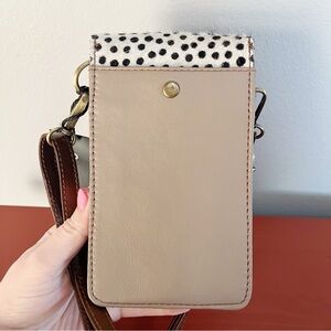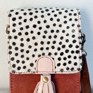 Brand new with tags Soruka Gia Crossbody Phone Bag. Terracotta orange/brown with anima print and pink tassel. Two compartments. Pocket on exterior to fit money or cards. Snap closure. Removable adjustable strap. NWT. Travel, boho, animal print, western, cowgirl.