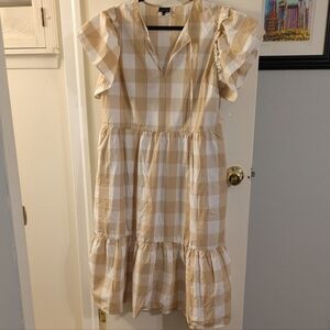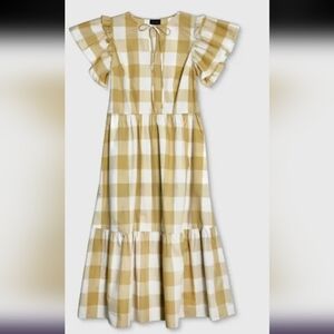 Stylish midi dress with plaid design. Features flutter sleeves, tiered skirt, and pockets! Ideal for casual wear. PTP measures 22, better for a XL or Large. Side zip, 100% cotton.