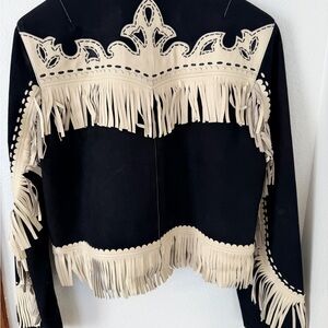 Elegant leather jacket with intricate fringe and button details. Black and cream color scheme. Perfect for a chic look.