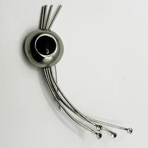 Bold vintage brooch, approx. 5β long, with a black faceted costume stone and four rhinestones on curved metal spray arms. Unmarked. Metal appears steel-toned, not silver.