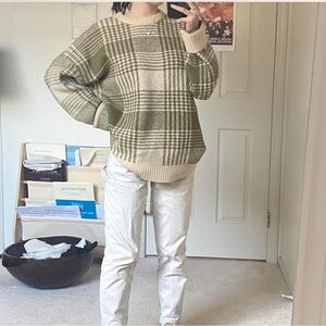 Chic plaid sweater with olive and beige tones. Perfect for layering. Comfortable and stylish.