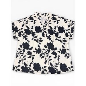Short sleeve V-neck blouse in a soft cream tone with an allover black floral print. Made from lightweight 100% polyester with a smooth, breathable feel and an easy drape. Designed with a clean split neckline and relaxed fit that works tucked or worn loose. A versatile staple that transitions easily from work to weekend.