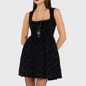 Chic black mini dress with velvet texture. Features a fitted bodice and flared skirt. Perfect for a night out.