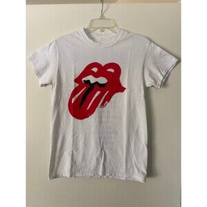 This classic white graphic tee features the iconic Rolling Stones 'Tongue and Lips' logo in bold red on the front. It's the official shirt for the timeless band’s No Filter 2019 rock and roll tour. Back lists performance cities: