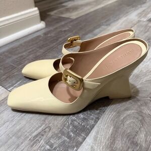 Keywords: Bottega Veneta, wedge mules, patent leather, square toe, mary jane, gold buckle, designer heels, luxury footwear, cream heels, statement shoes, chic mules, sculptural heel