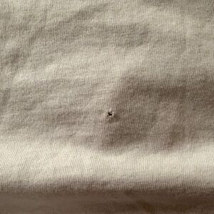 White t-shirt featuring colorful sardine can graphics. Unique and artistic design. Small hole shown!