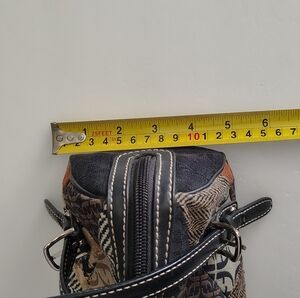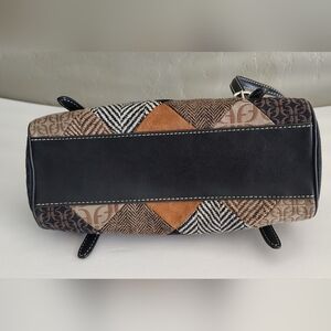 Patchwork Fossil shoulder handbag with two adjustable buckle handles. Very clean inside and out. Patchwork has a variety of textures and materials; leather, monogram, tweed. Has a lot of visual appeal and features a neutral color palatte.