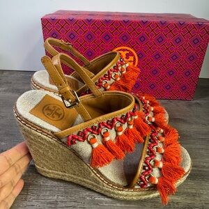 Tory Burch Niyah Espadrille Orange Tassel Wedge Sandals size 6.5