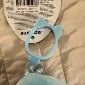 Cute Squishmallows key holder. Features a smiling face. Blue and silver design. Perfect for keys or cards.