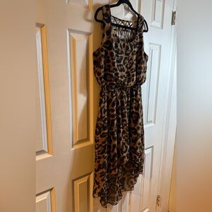 Stylish leopard print dress. Sleeveless design. Flowy and elegant.