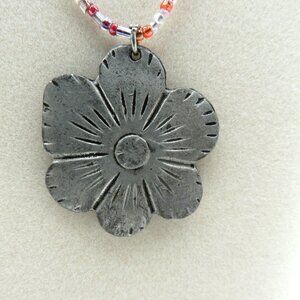 Pewter Flower Necklace 1.5" Pendant Adjustable 15" Multicolor Glass Beads