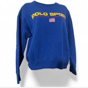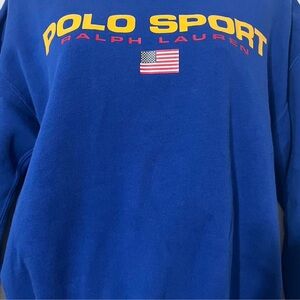 Polo Sport Ralph Lauren crewneck sweatshirt in a vibrant cobalt blue. Features the classic Polo Sport logo across the chest with Ralph Lauren lettering and an American flag detail. Soft fleece interior with a relaxed, comfortable fit.