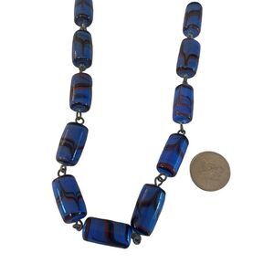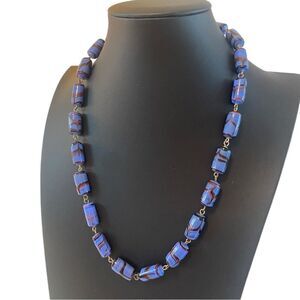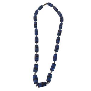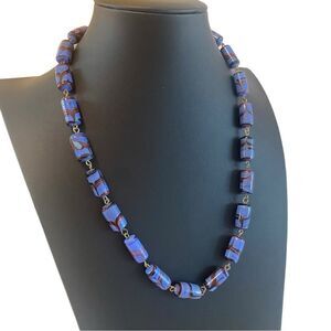 Vintage Ceramic Beaded Blue & Red Cylinder Necklace w/Screw Clasp.