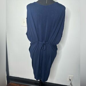 This navy blue dress is perfect for any occasion. Its sleek design offers a flattering fit, making it a must-have in your wardrobe. Pull over head. Stationary ties on the sides.