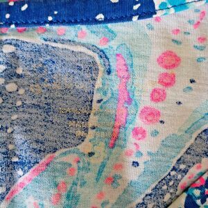 Easy to wear dress with scoop neckline and 3/4 sleeves. Classic jersey t-shirt dress in a lively starfish print.