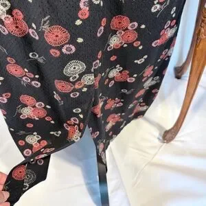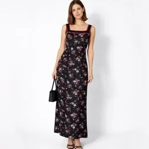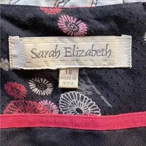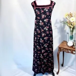 Step into effortless bohemian charm with this vintage Sarah Elizabeth maxi dress, likely from the late 90s to early 2000s. Crafted in India from lightweight woven fabric, it features a striking square neckline framed with contrast red trim, a sleeveless silhouette, and a sweeping full-length skirt. The black Swiss dot background is adorned with an allover floral medallion print in shades of rose, blush, and ivory for a timelessly feminine look. Perfect for summer festivals, coastal getaways, or adding a touch of vintage romance to your everyday style.