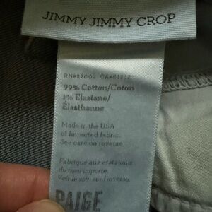 This is a pair of new with tags (Nordstrom rack) jimmy jimmy crop blue denim jeans by Paige in the Kendall wash in a size 24. Zip and button close. Five pocket design machine wash. Cotton and elastane. Made in USA.