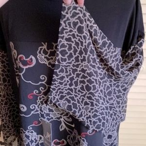 Charcoal-black floral top.