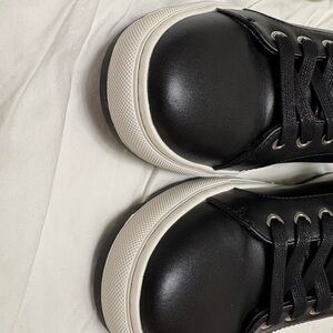 Sleek black leather sneakers with contrasting white soles. Includes branded dust bag.