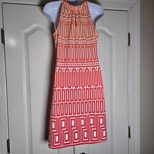 The Jude Connally Geometric Ombra Orange/Red Summer Dress in size small is a stylish and vibrant option for the summer season. Made from a comfortable blend of nylon and spandex, this knee-length dress features a sleeveless design with a pullover closure for easy wear. The geometric pattern in multicolor adds a trendy touch to this sundress, perfect for staying fashionable and comfortable during the warmer months. Designed in the United States by the brand Jude Connally, this dress is a great addition to any woman's summer wardrobe. Cleaned according to manufacturer recommendation. Measurements and condition are shown in photos.