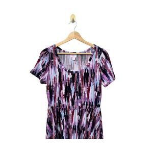 Pretty purple/multicolor graphic print. Scoop neck. Slightly puffed sleeve. In excellent condition!