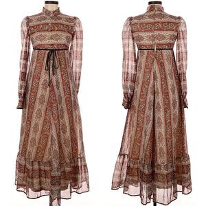 Vintage 1970s Floral Gown Maxi Dress Prairie Cottagecore Victorian Neckline 12