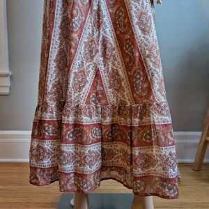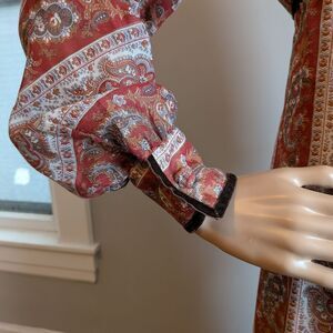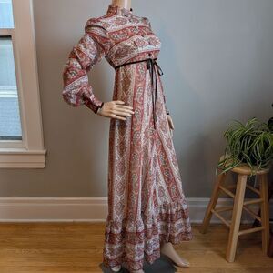 Vintage 1970s unbranded floral/paisley print maxi dress. Long puff sleeves. High Victorian neckline with buttons down front. Velvet detailing at waist and sleeve cuffs. Ruffled/tiered skirt hem. Zip up back. Dress is in good vintage condition with one button on sleeve cuff damaged. Please see photo.