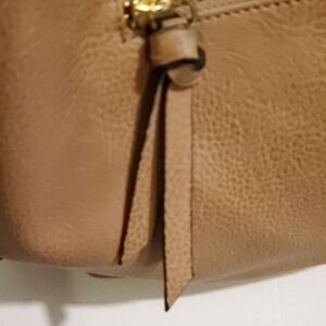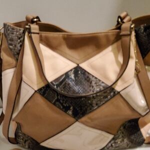 Awesome tote/ shoulderbag ,cream,peach and black.Adjustable and removable strap. Back pocket,inside pouches and zippered pocket. GENTLY loved. Has small spot of blue at bottom. Barely visible. Has a small spot in bottom ,can be wiped clean. Priced accordingly. It doesn't disappoint!