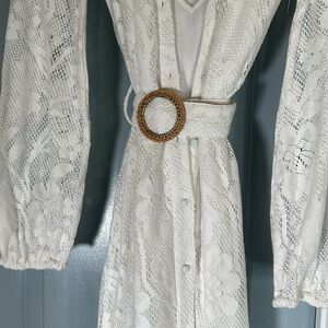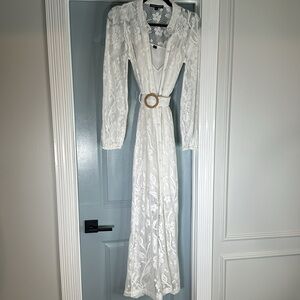 Gorgeous white dress. Super comfy and soft. Worn once for video shown here! White event ready whether day party, vacation, date night or any occasion! Designed to exude feminine floral elegance while keeping you comfortable for any occasion, this Lace Button-Up Maxi Dress radiates alluring sophistication.