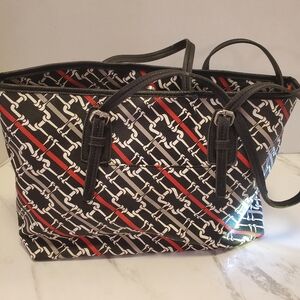New Dana Buchman equestrian bag. Beautiful and colorful ! It has 3 sections,middle zippered pocket and pouches and zippered pocket. Feet on bottom,beautiful lining and measures 9 1/2 high ,15 wide and straps are 11 in.