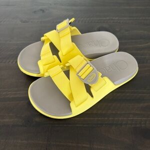 Chaco Chillos slide sandals in Limelight yellow with gray footbed, women’s size 6. Lightweight, cushioned comfort sandals with adjustable webbing straps and supportive EVA footbed.