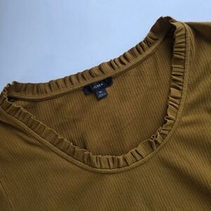 A mustard yellow ribbed knit top by J. Crew. This charming top features a delicate ruffle trim along the neckline, adding a touch of feminine flair to a classic silhouette. The textured ribbing provides a comfortable and flattering fit. Perfect for a casual day out or a relaxed evening.