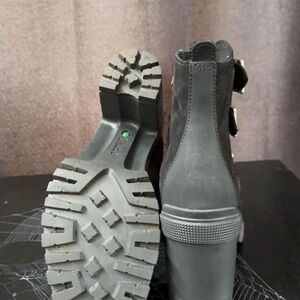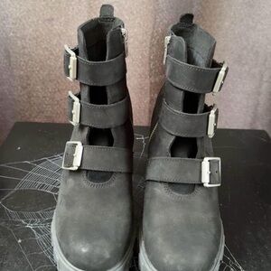 Chic black boots with triple buckle detail. Features a sturdy heel and side zipper. Worn only a few times , in excellent condition. Better Leather from a tannery rated silver for its water, energy, and waste management practices Side zipper ReBOTL™ fabric lining containing at least 50% recycled plastic Steel shank for arch supprt Footbed of EVA-blend foam for high-rebound cushioning Rubber lug outsole Shaft: 4 in./10.2cm Heel: 4 in./10.2cm