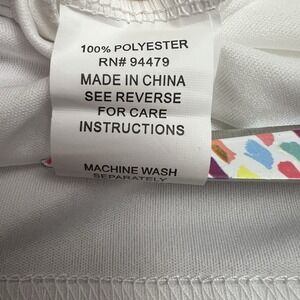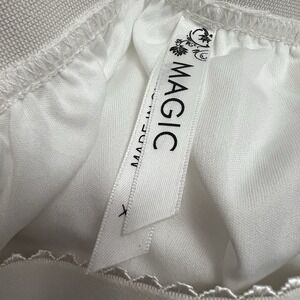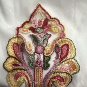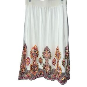 Magic brand midi skirt featuring sheer white mesh overlay with vibrant multicolor embroidered detailing. Fully lined for coverage. Pull-on elastic waistband for comfortable wear. Bohemian statement piece perfect for music festivals, vacations, or summer events. Size XL.