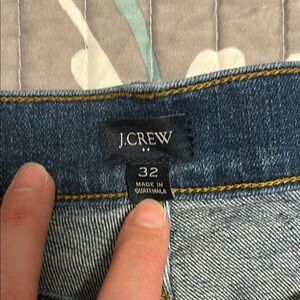 Experience timeless style with J. Crew's blue jean shorts, featuring a classic cut-off design and a raw hem edge. These shorts boast a medium to dark wash with natural fading, perfect for a casual, laid-back look.