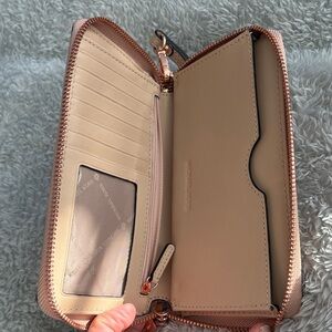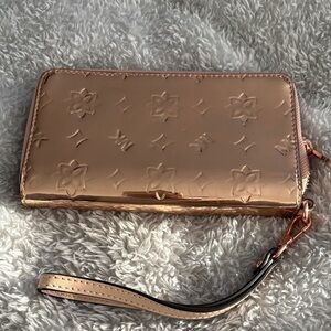 Chic Michael Kors wallet in rose gold. Features embossed floral design. Perfect for stylish outings. Used maybe 2 times in like new condition, from smoke and pet free home.