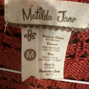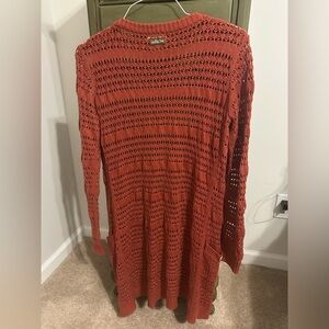 Chic open knit design. Rich rust hue. Ideal for layering. Good used condition. No visible rips or tears. Color is a rust red color. Crochet look. Cute pattern. Whimsical buttons.
