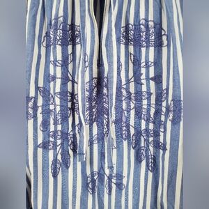 St. John's Bay sleeveless a-line dress. It features blue and white vertical stripes, a ruffled collar with a tie neckline, and blue floral embroidery on the chest.