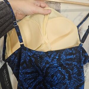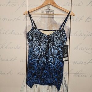 Keywords: Miraclesuit, tankini, swim top, snake print, blue black, adjustable straps, ruched, flattering, beachwear, resort wear, swimwear, size 16, new with tags, plus size