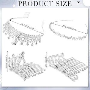 Measurements: Crown headband: 5 cm high, 12.5 cm wide; Rhinestone headband: 1.5 cm high, 12 cm wide; Crown with hair comb: 7 cm high, 5.5 cm wide