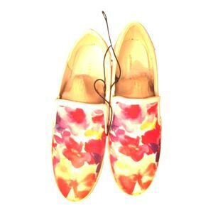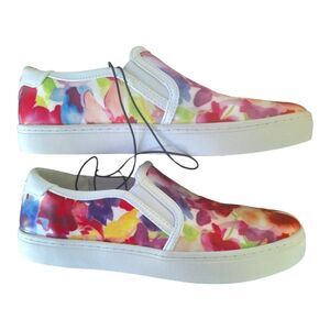 From Spring 2017, new in box, unworn slip-on floral sneakers by Liz Claiborne. Cushy comfort, bold floral colors of pink, red, blue, purple, yellow, green, trimmed in white with white stitching.