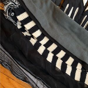Stylish winter accessories set featuring hats, gloves, and scarves. Includes black, white, and pink colors. Perfect for cold weather.