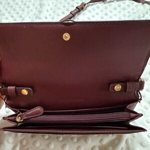 Stylish Michael Kors crossbody with wine and tan hues. Features elegant gold chain detail. Perfect for versatile wear. Noticeable wear and tear on strap and a little on the lining when opening purse shown in pictures.