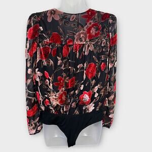 FATE Velvet Burnout Black, Red & Mauve wrap floral bodysuit size large Semisheer