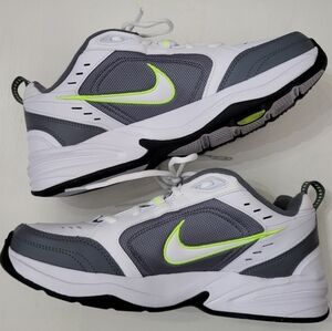 Stylish and comfortable Nike Air Monarch IV. Features white and gray design with neon green accents. Perfect for athletic activities. Size Mens 10.5. New condition.